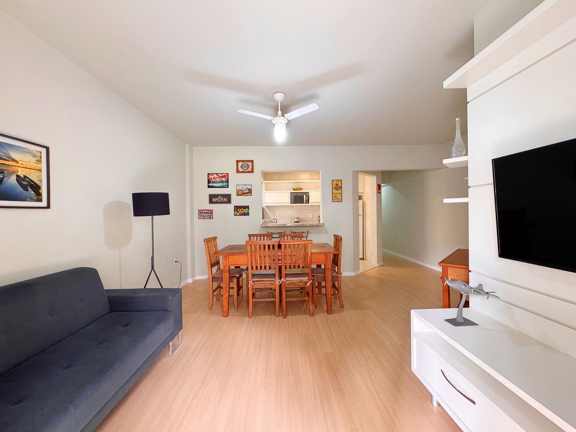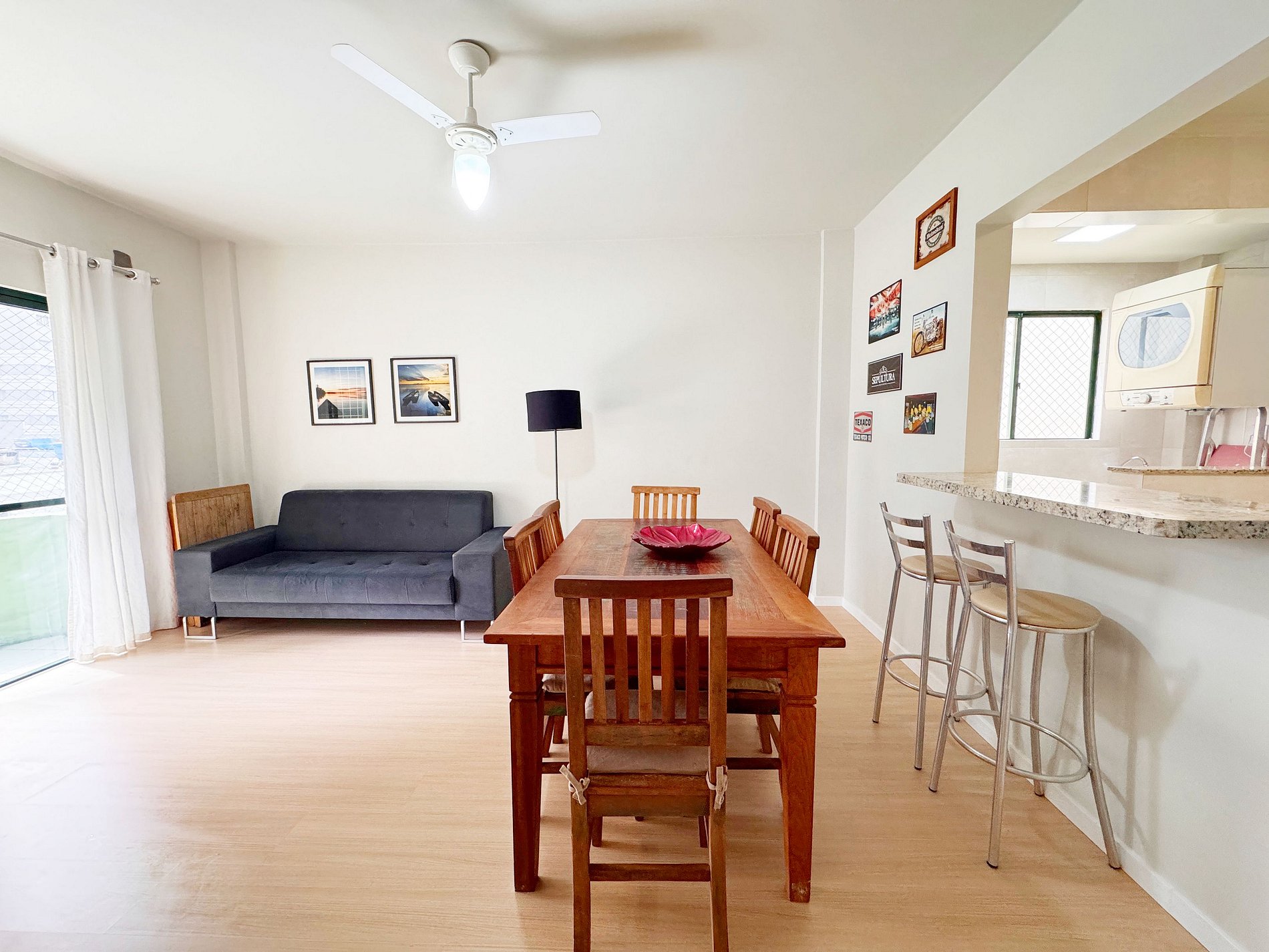 - Sala de estar em conceito aberto com mesa de jantar e sofá;