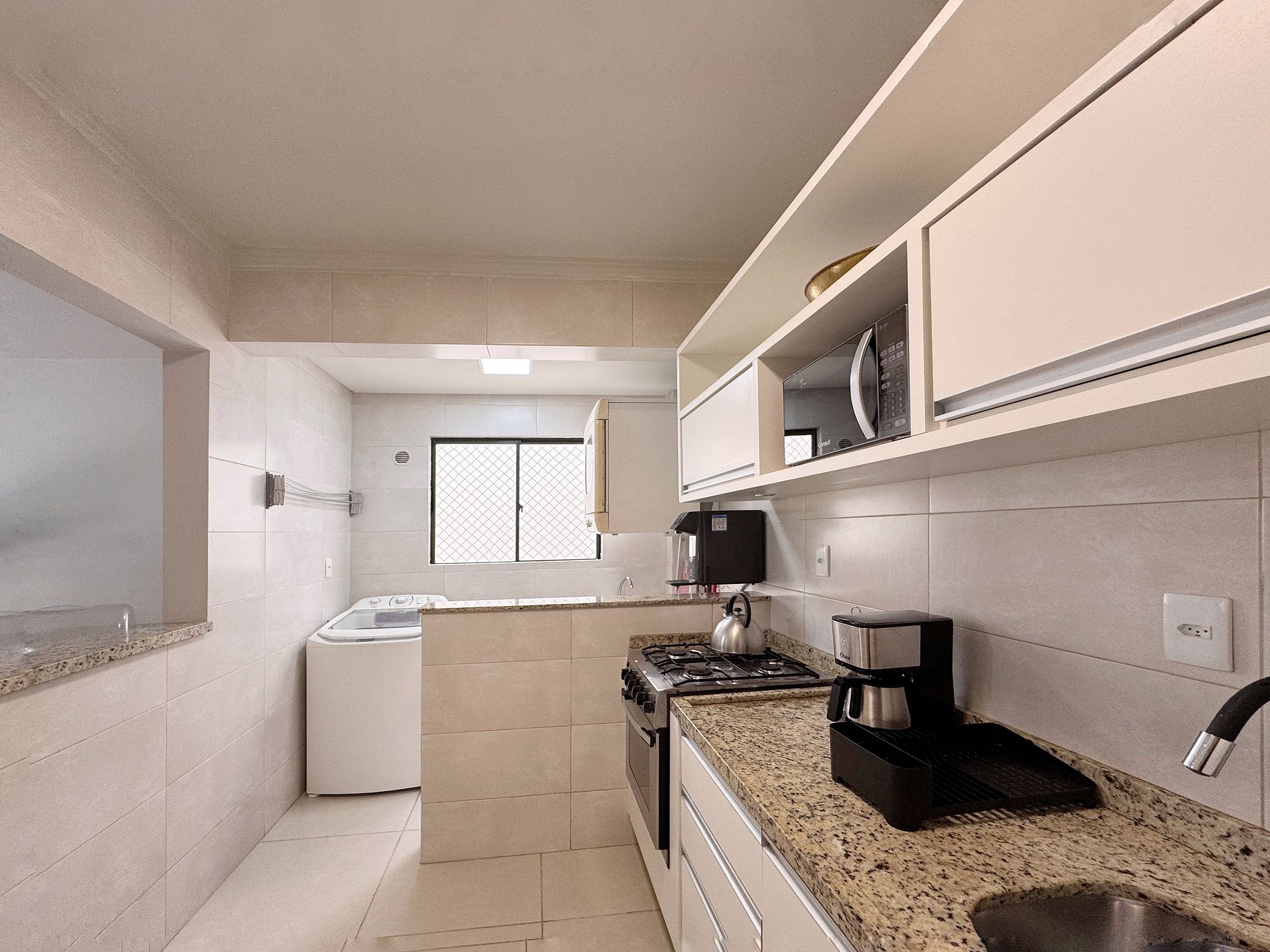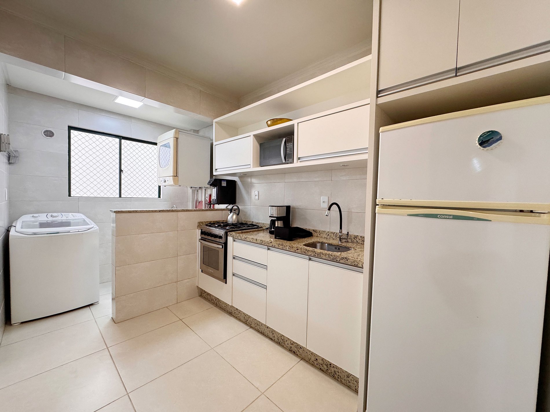 - Cozinha completa com geladeira, fogão, forno, microondas, sanduicheira, cafeteira, liquidificador, utensílios domésticos e panelas;