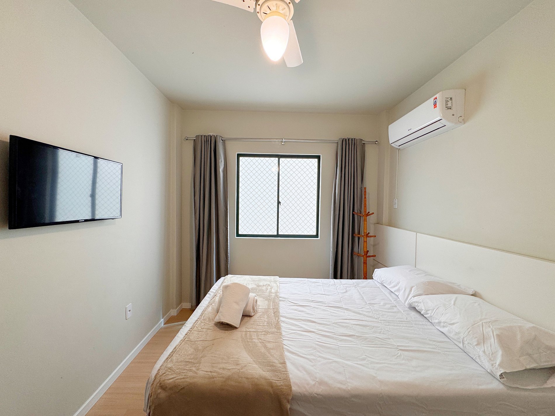 1 suíte com cama de casal, Smart TV, ar condicionado, armário para guardar roupas