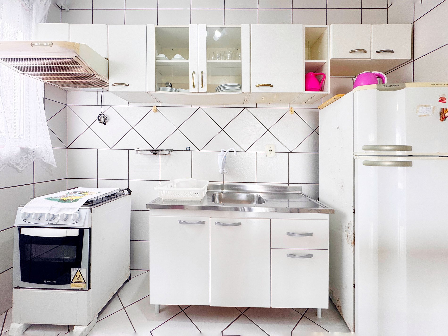 - Cozinha completa com geladeira, fogão, forno, microondas, kit café, utensílios domésticos e panelas;