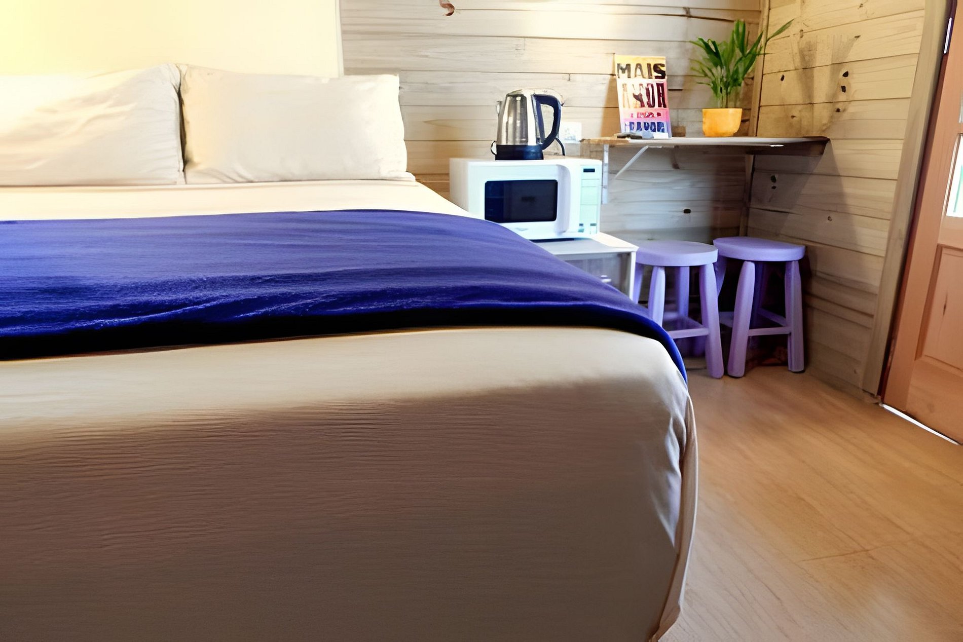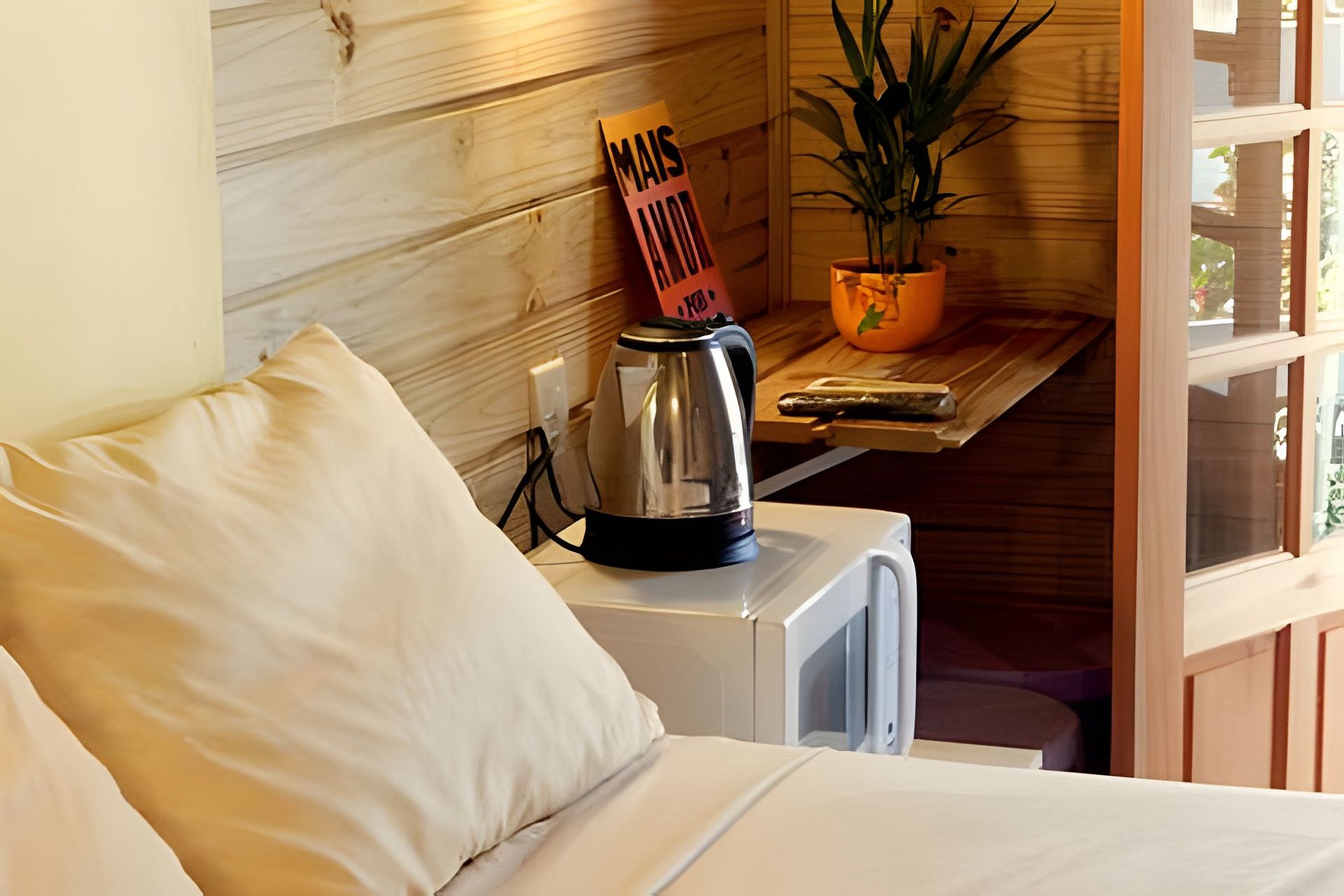 Pensando no sono tranquilo – estamos em uma região silenciosa - oferecemos ótimas camas, luminária de cabeceira, tomadas perto da cama e ar condicionado split, para que tudo fique muito aconchegante. E para complementar sua estadia, oferecemos também roupa de cama e banho.