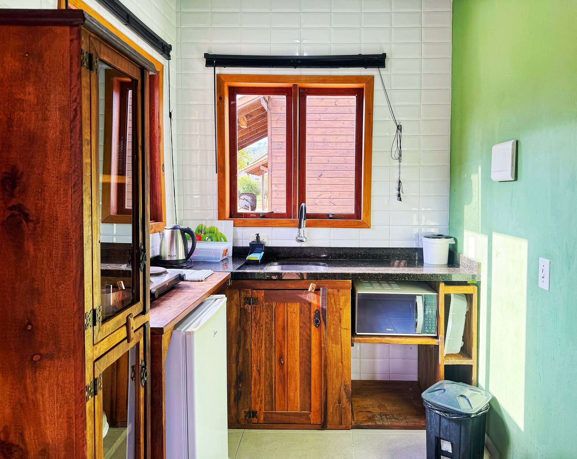 - Cozinha compacta com micro-ondas, fogão, frigobar, cafeteira Nespresso, kit café e utensílios básicos de cozinha;