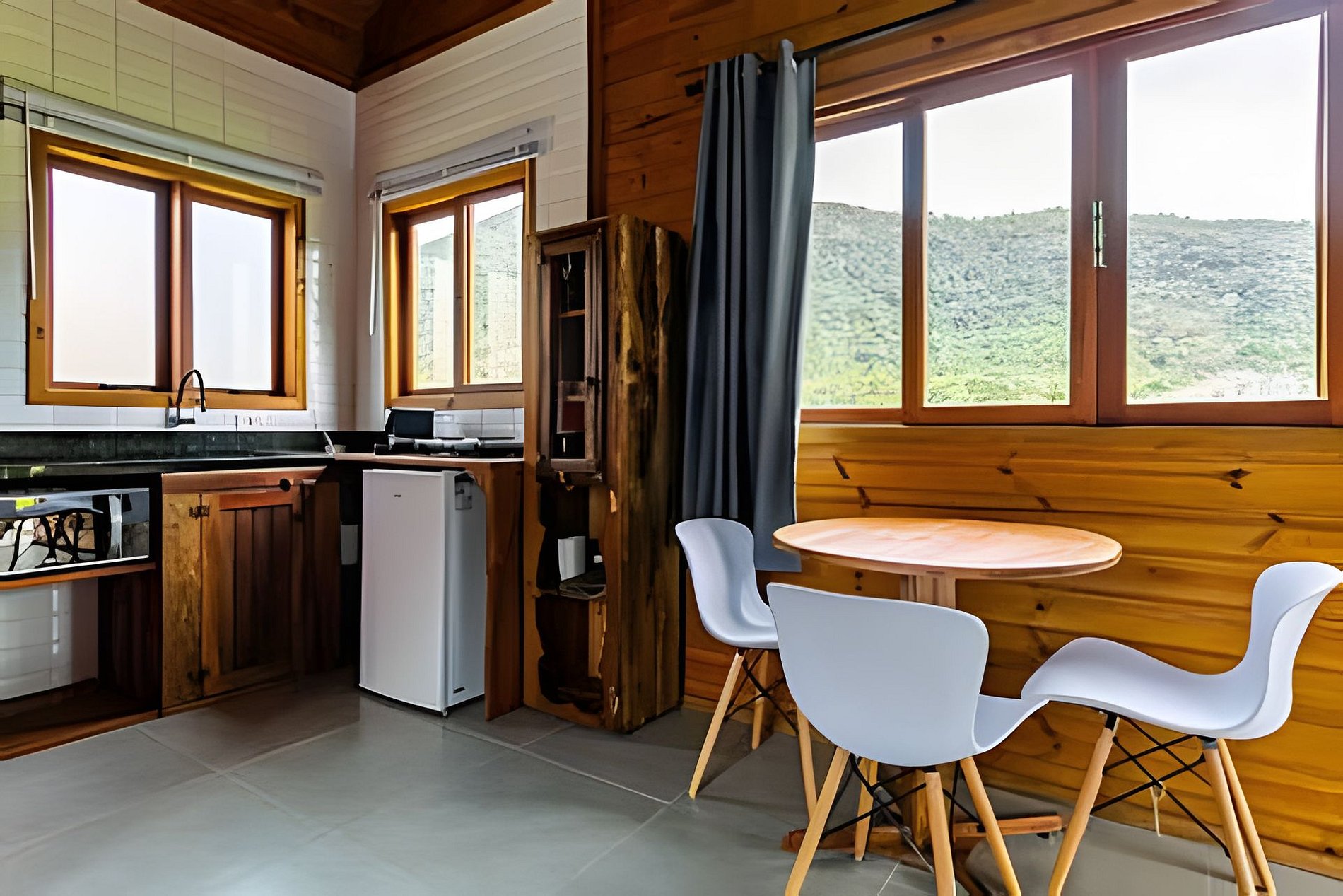 - Ambiente de estar com mesa e cadeiras, sofá-cama de casal (indicado para uma pessoa adulta e uma criança);