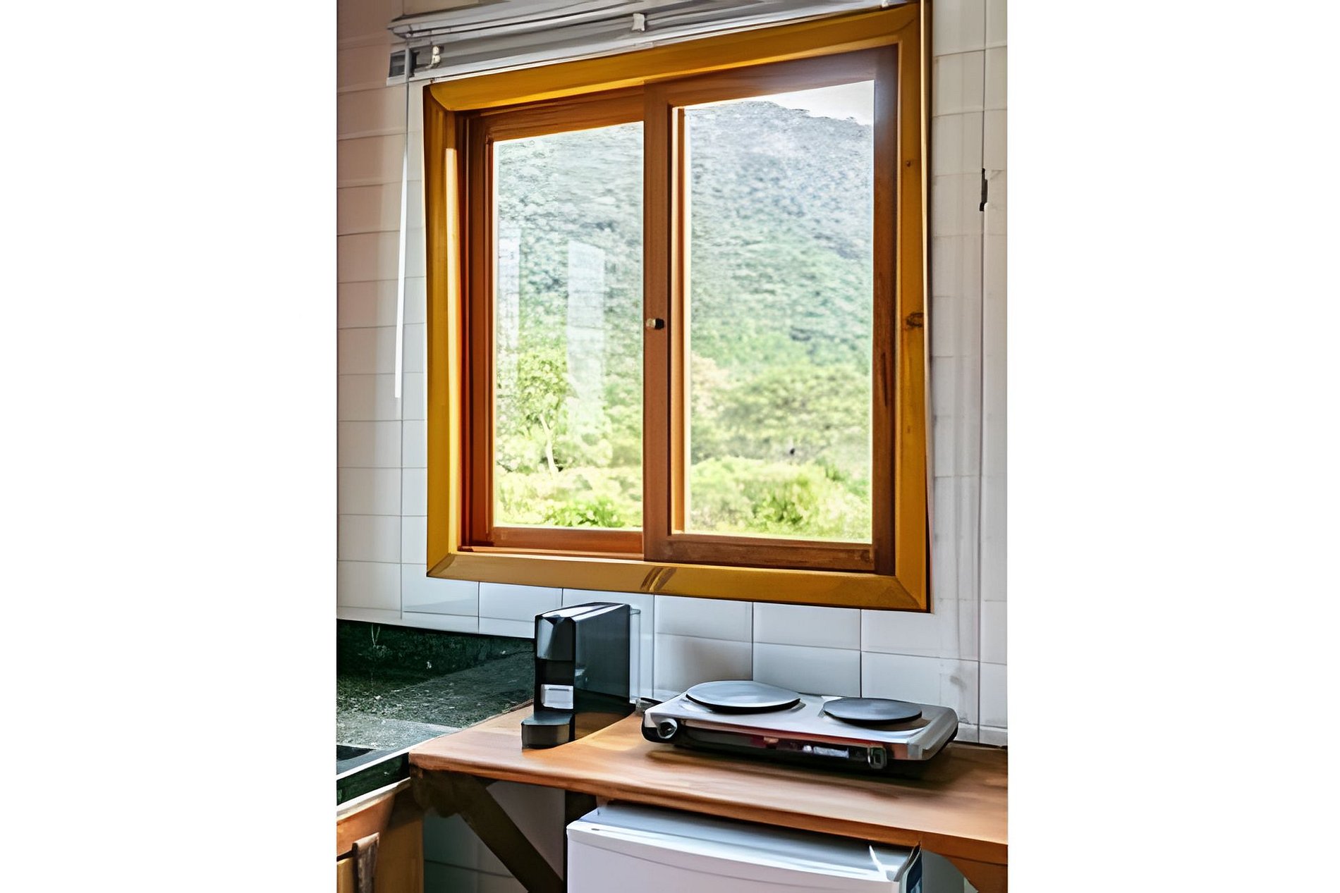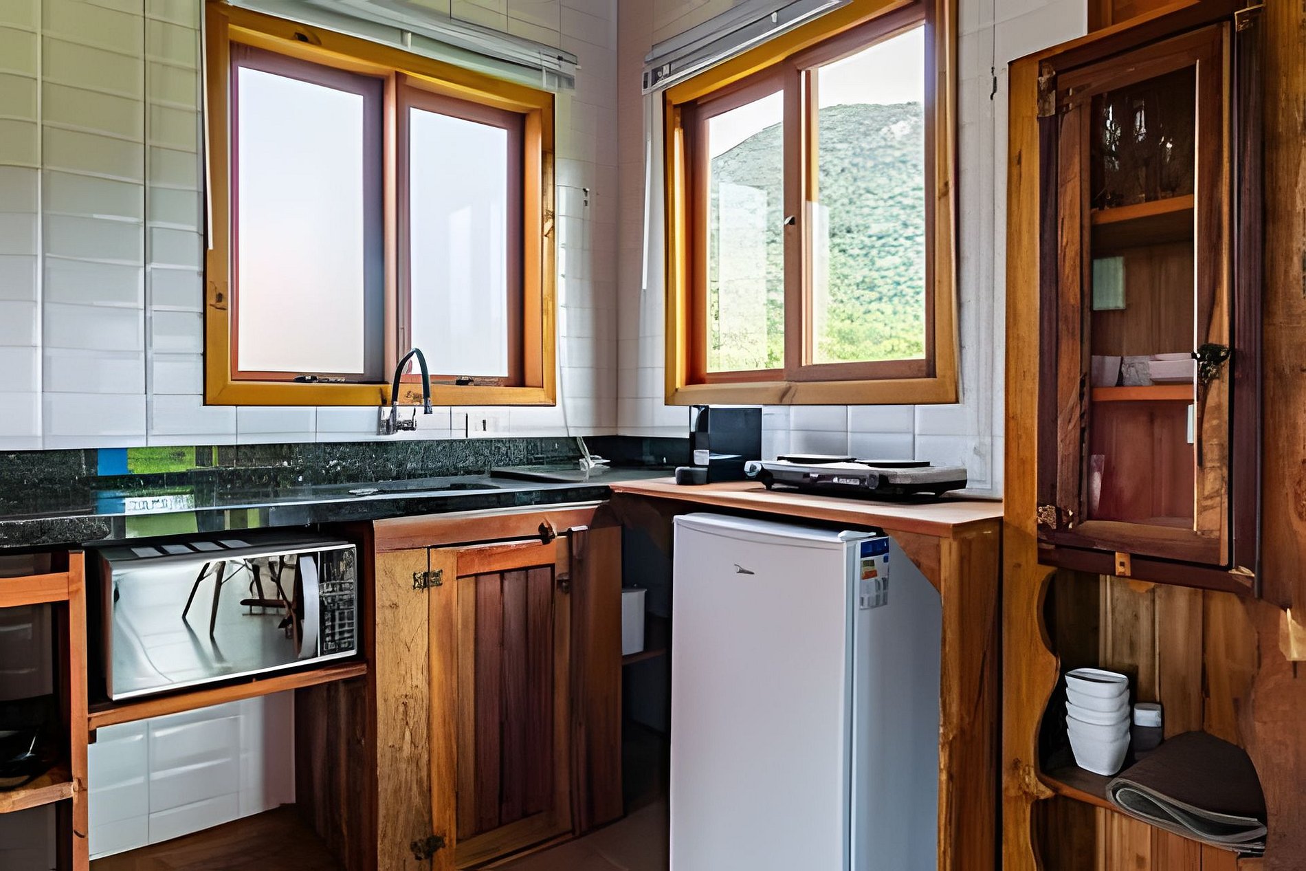 - Cozinha compacta com micro-ondas, fogão, frigobar, cafeteira Nespresso, kit café e utensílios básicos de cozinha;