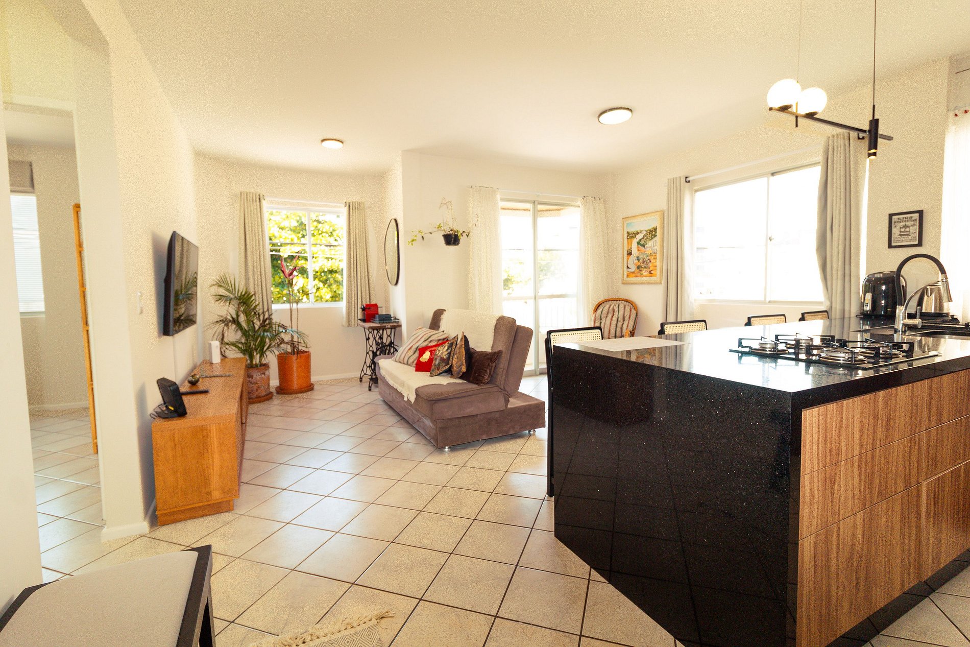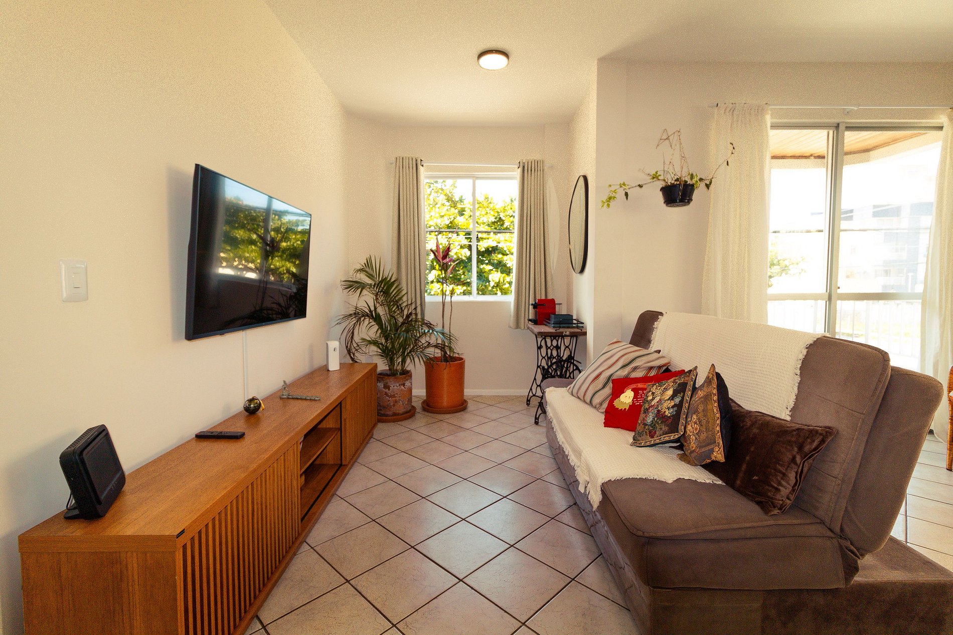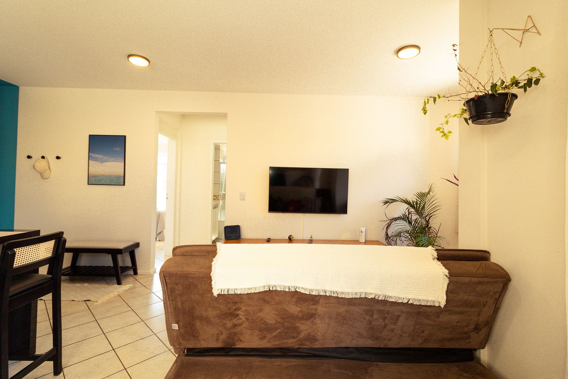 - Sala de estar em conceito aberto Smart TV e sofá-cama para uma pessoa;