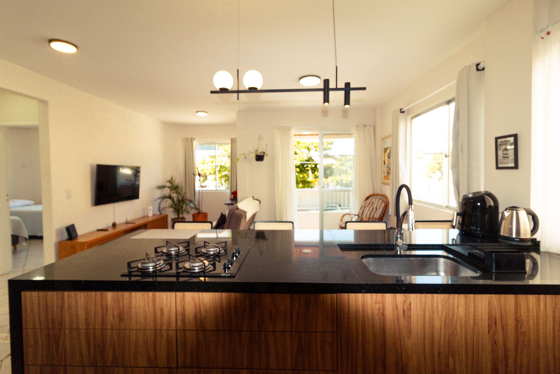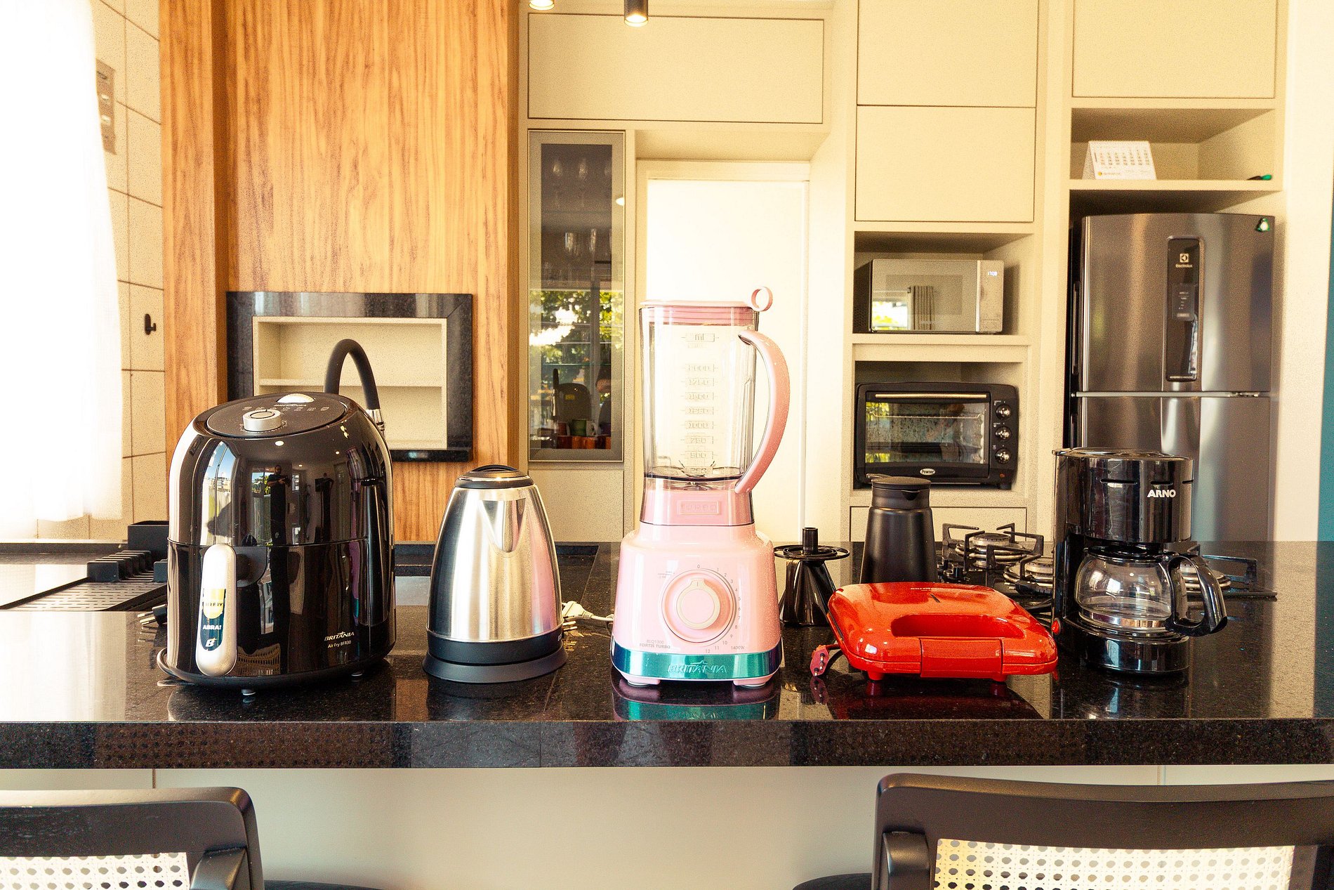 - Cozinha completa com geladeira, fogão, forno, microondas, kit café, liquidificador, utensílios domésticos e panelas;