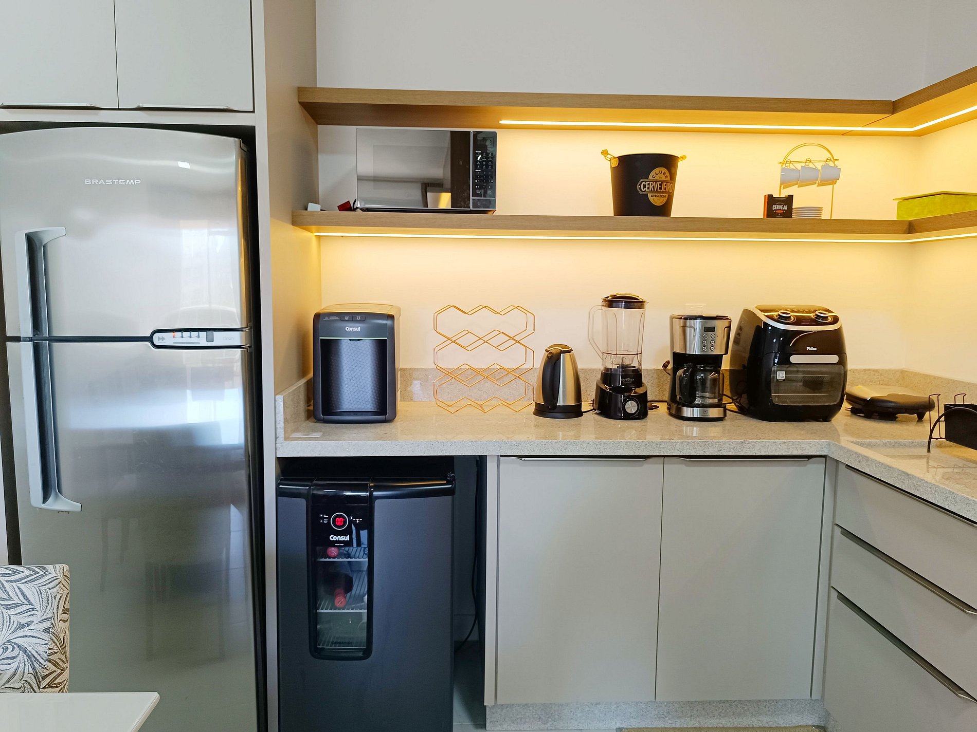 - Cozinha completa, geladeira – duplex, fogão, micro-ondas, mesa com 6 lugares, cafeteira e demais utensílios;