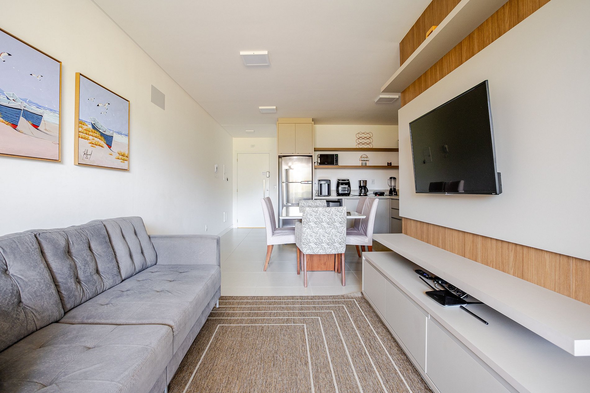 - Sala de estar com sofá, rack, TV smart, integrada à cozinha;