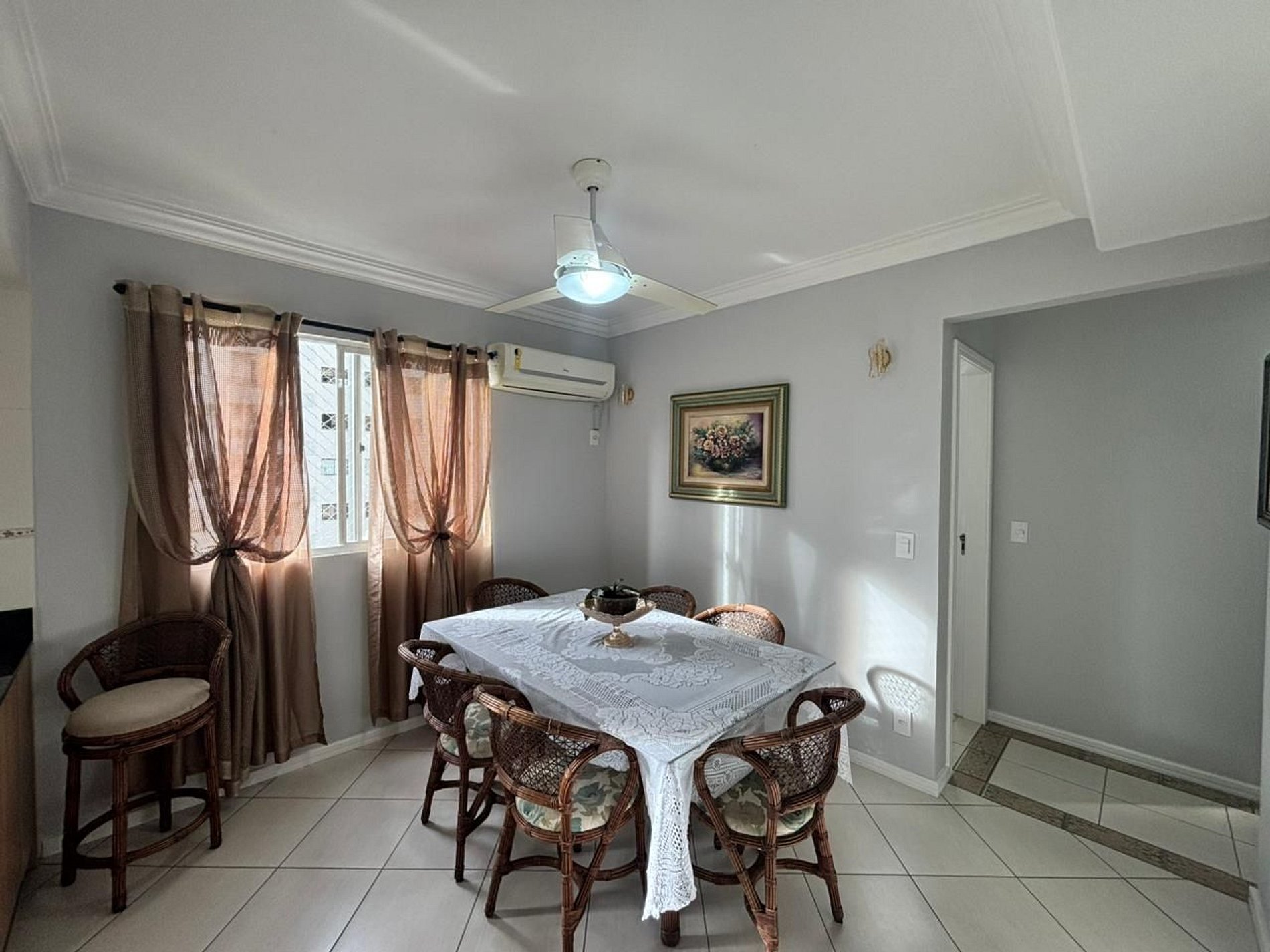 O imóvel conta com ambientes bem distribuídos e uma sacada ampla com churrasqueira, perfeita para refeições e momentos de convivência após um dia de praia.
