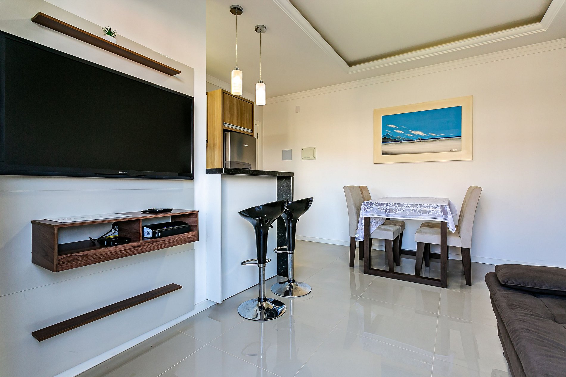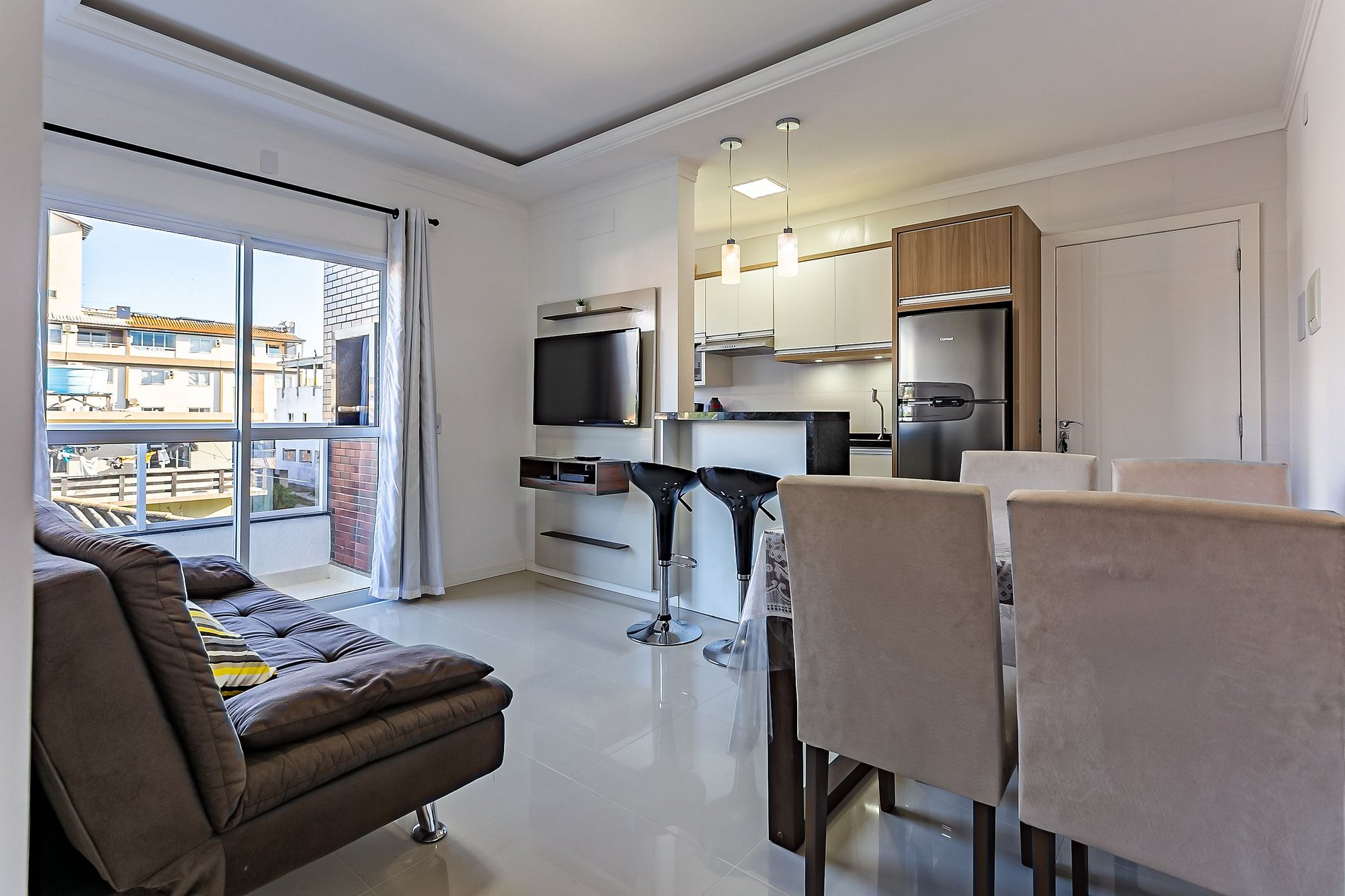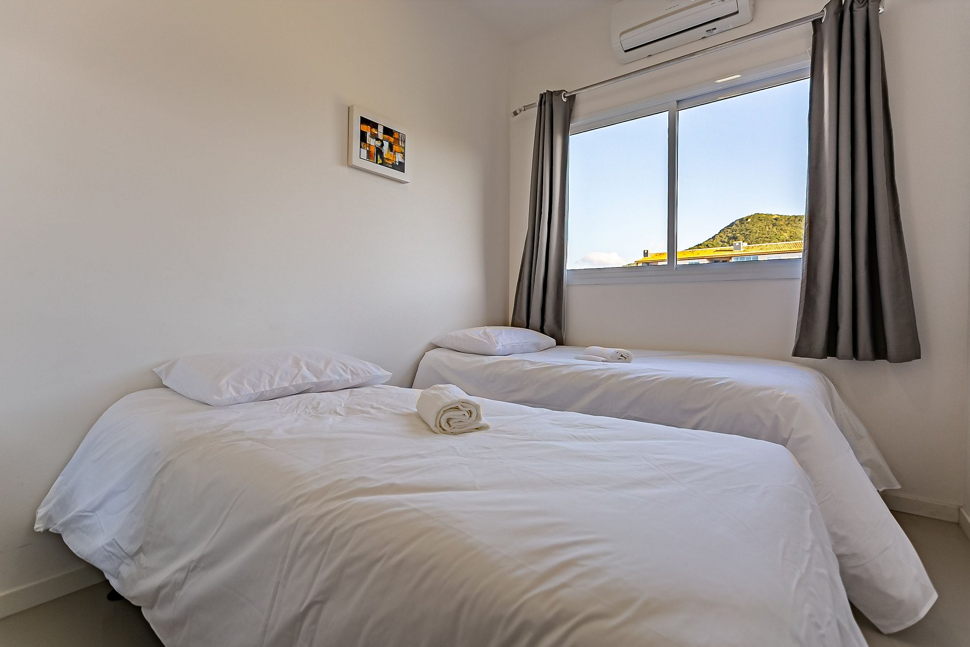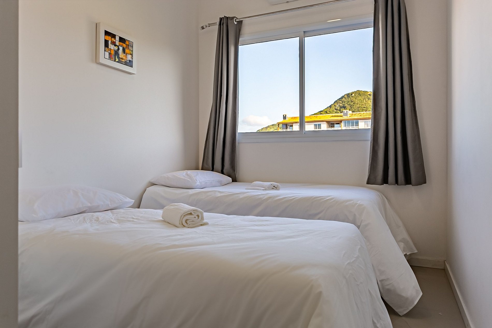 Apartamento amplo e confortável com sacada na sala e na suíte, a poucos metros da linda praia do Santinho. Para o conforto de nossos hóspedes, o apartamento possui: - 1 suíte com cama de casal, Smart TV, ar condicionado, armário para guardar roupas e sacada privativa; - 1 quarto com 3 camas de solteiro, armário para guardar roupas e ar condicionado; - 1 banheiro social; - 1 TV na sala de estar com canais a cabo; - Sala de estar em conceito aberto com mesa de jantar e sofá-cama; - Wifi de 200MB disponível; - Cozinha completa com geladeira, fogão, forno elétrico, microondas, sanduicheira, cafeteira, liquidificador, utensílios domésticos e panelas; - Roupas de cama e banho - Máquina de lavar roupa e varal para secar; - Sacada com churrasqueira e utensílios; - Vaga de garagem coberta para 1 carro pequeno;