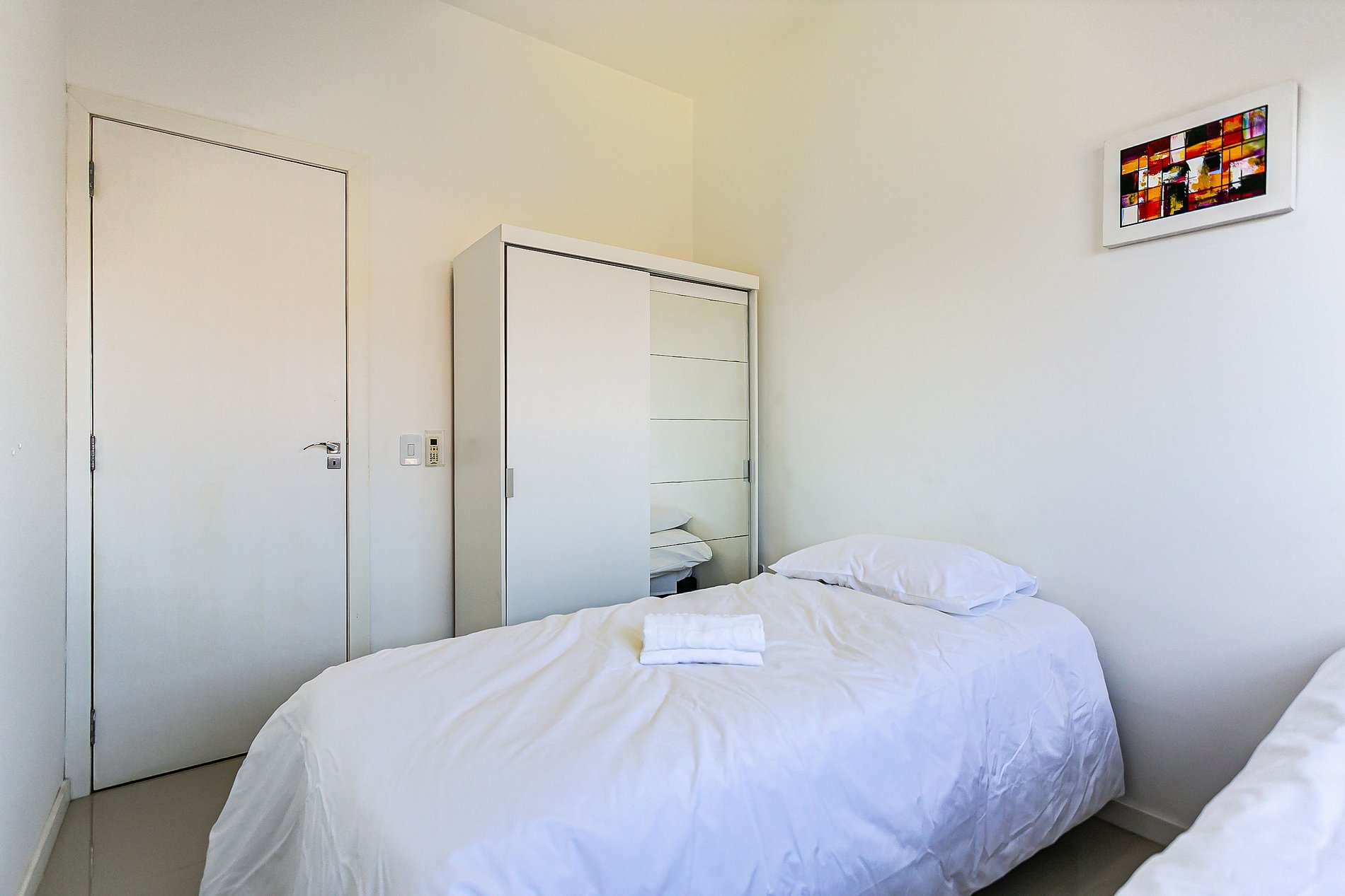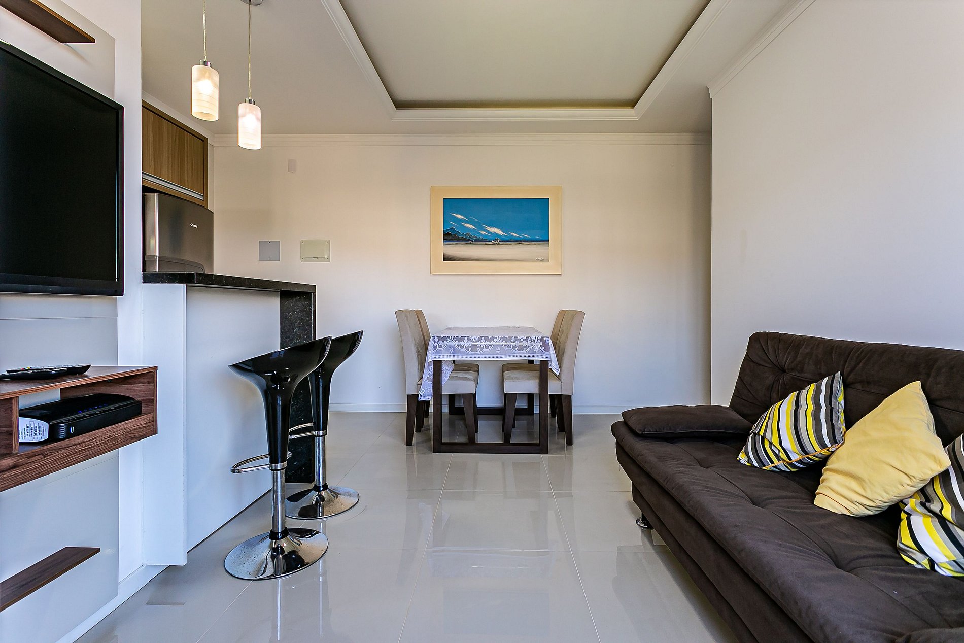 Para o conforto de nossos hóspedes, o apartamento possui: - 1 suíte com cama de casal, Smart TV, ar condicionado, armário para guardar roupas e sacada privativa; - 1 quarto com 3 camas de solteiro, armário para guardar roupas e ar condicionado; - 1 banheiro social; - 1 TV na sala de estar com canais a cabo; - Sala de estar em conceito aberto com mesa de jantar e sofá-cama; - Wifi de 200MB disponível; - Cozinha completa com geladeira, fogão, forno elétrico, microondas, sanduicheira, cafeteira, liquidificador, utensílios domésticos e panelas; - Roupas de cama e banho - Máquina de lavar roupa e varal para secar; - Sacada com churrasqueira e utensílios; - Vaga de garagem coberta para 1 carro pequeno;