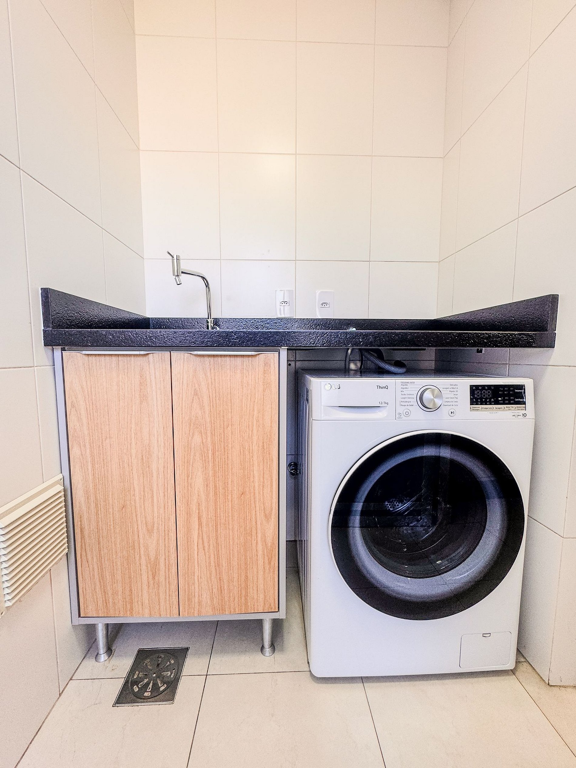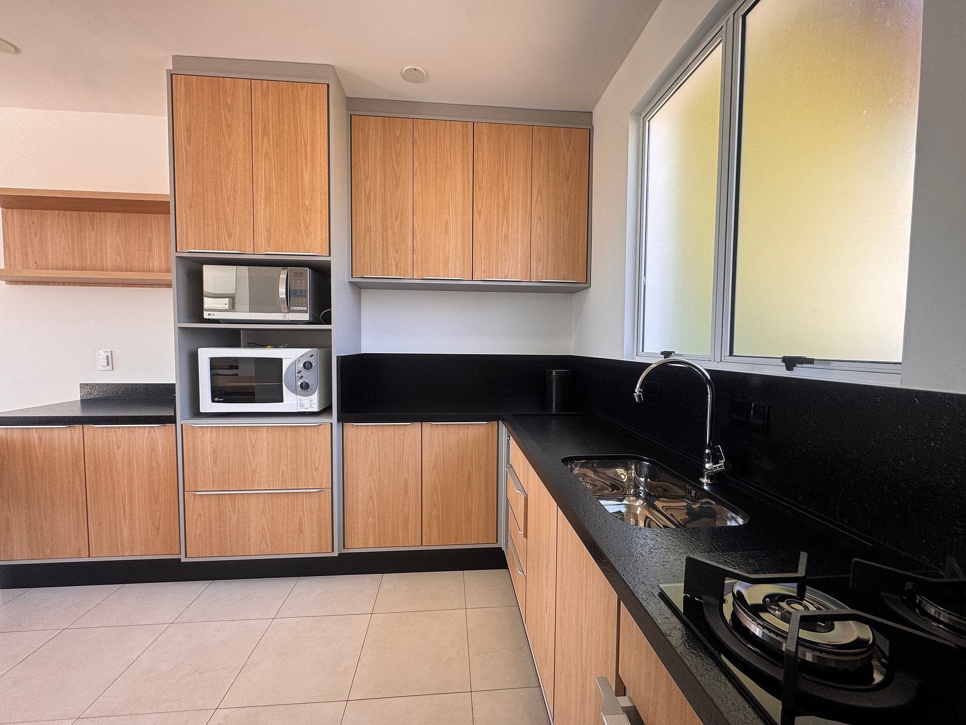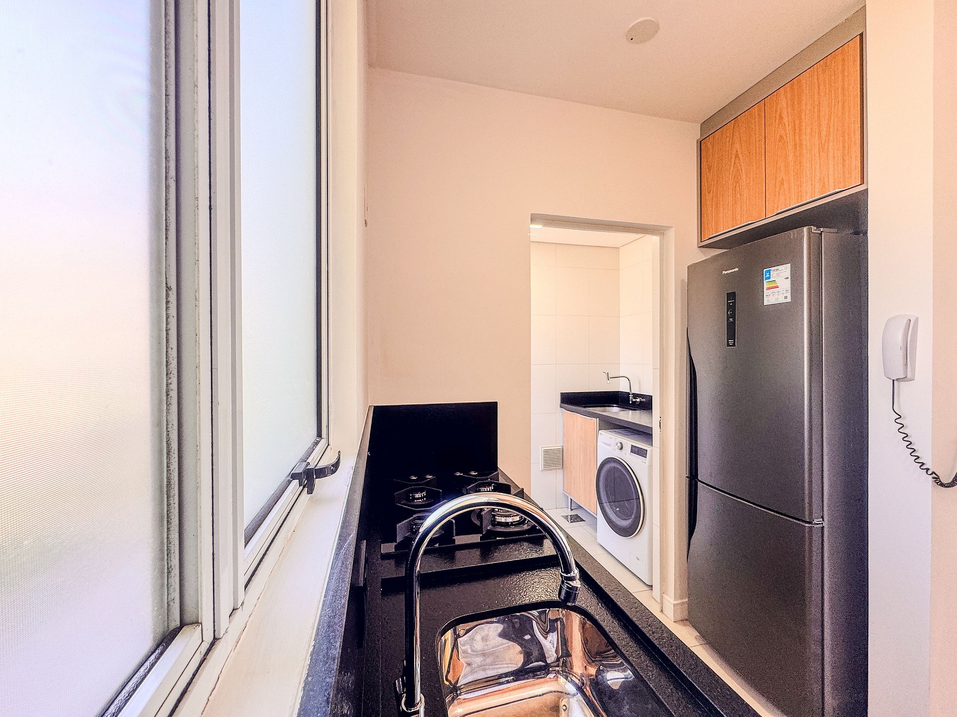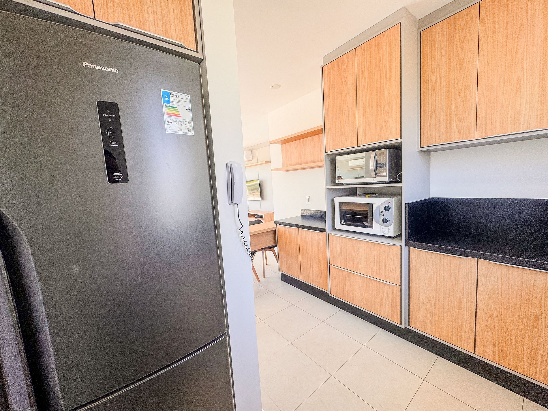 — Cozinha com fogão, geladeira ‘duplex’, micro-ondas, chaleira elétrica, cafeteira, liquidificador, sanduicheira, panelas, louças e utensílios de cozinha;