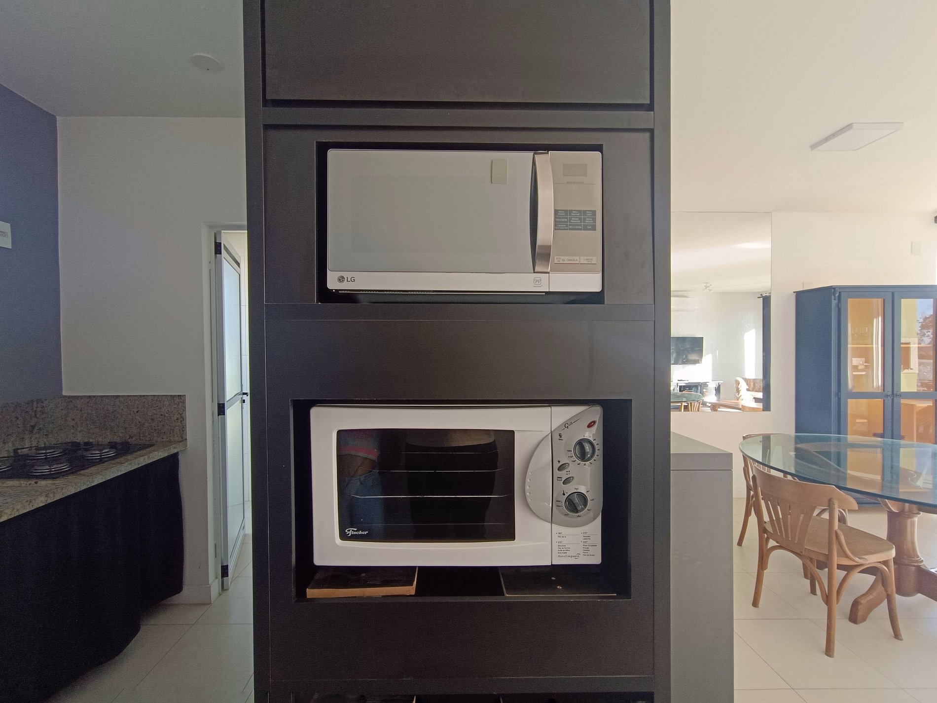 — Cozinha com fogão, geladeira ‘duplex’, micro-ondas, chaleira elétrica, cafeteira, liquidificador, sanduicheira, panelas, louças e utensílios de cozinha;
