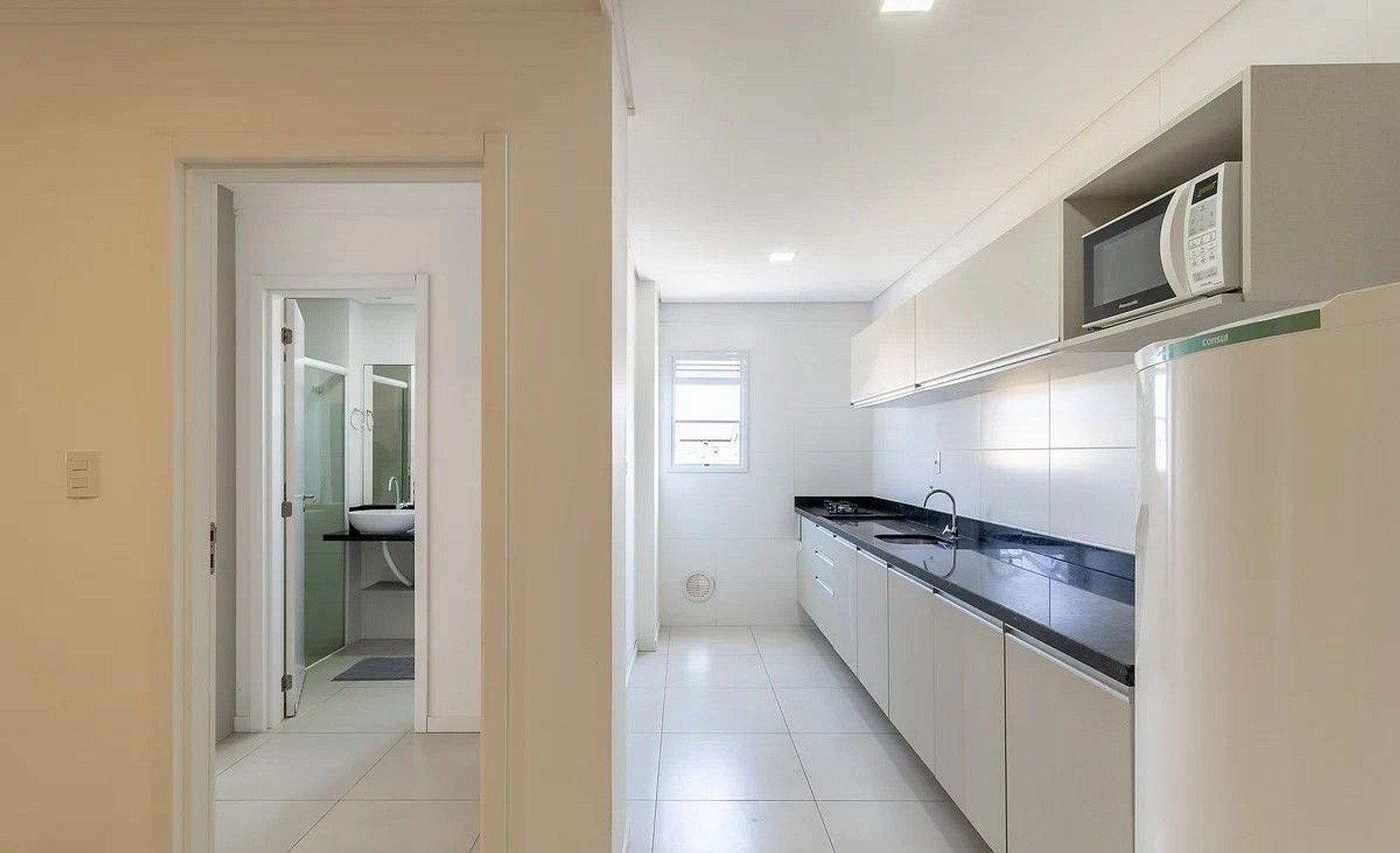 - Cozinha equipada com geladeira, fogão, micro-ondas, sanduicheira, chaleira elétrica, liquidificador, panelas, louças e utensílios;