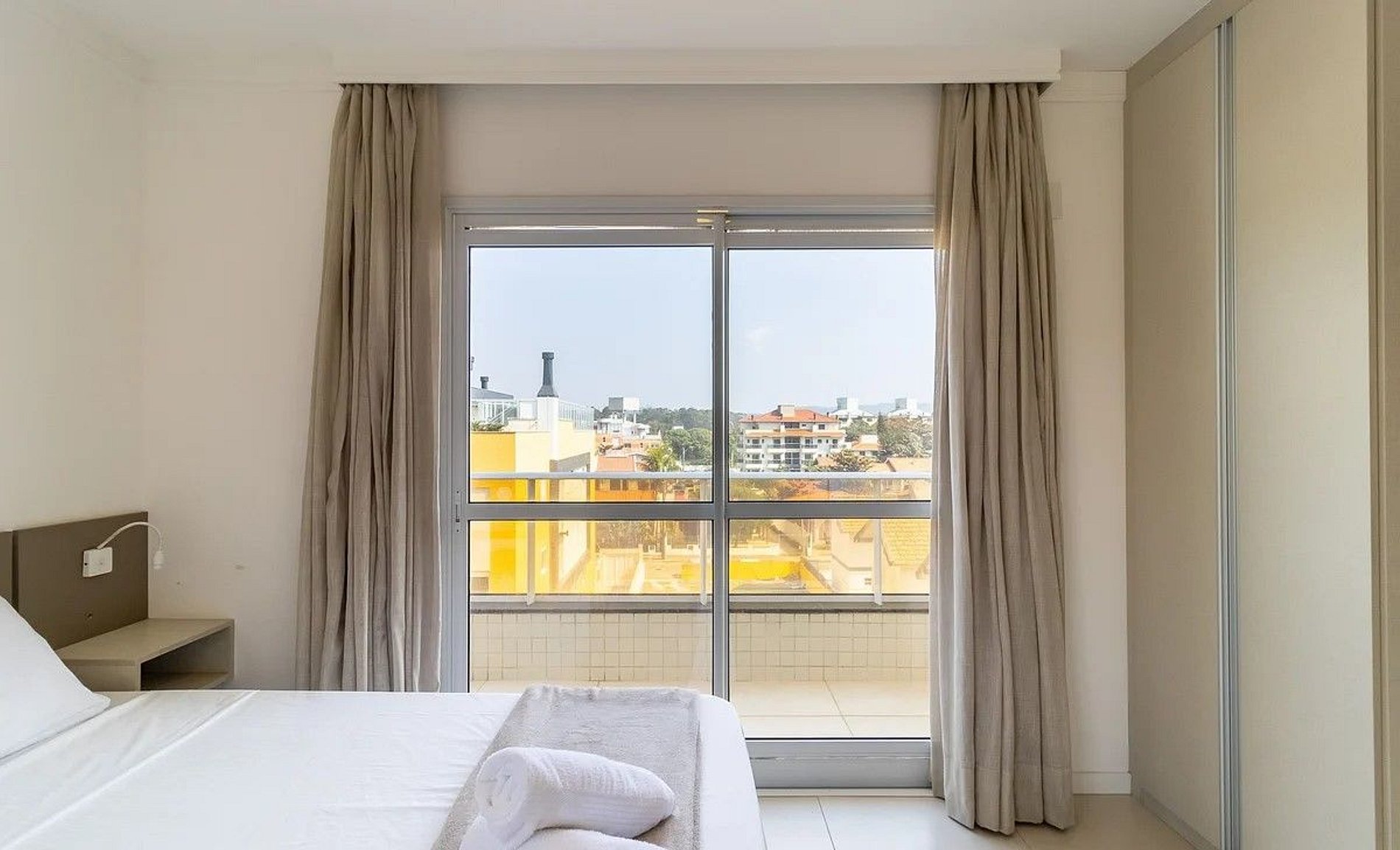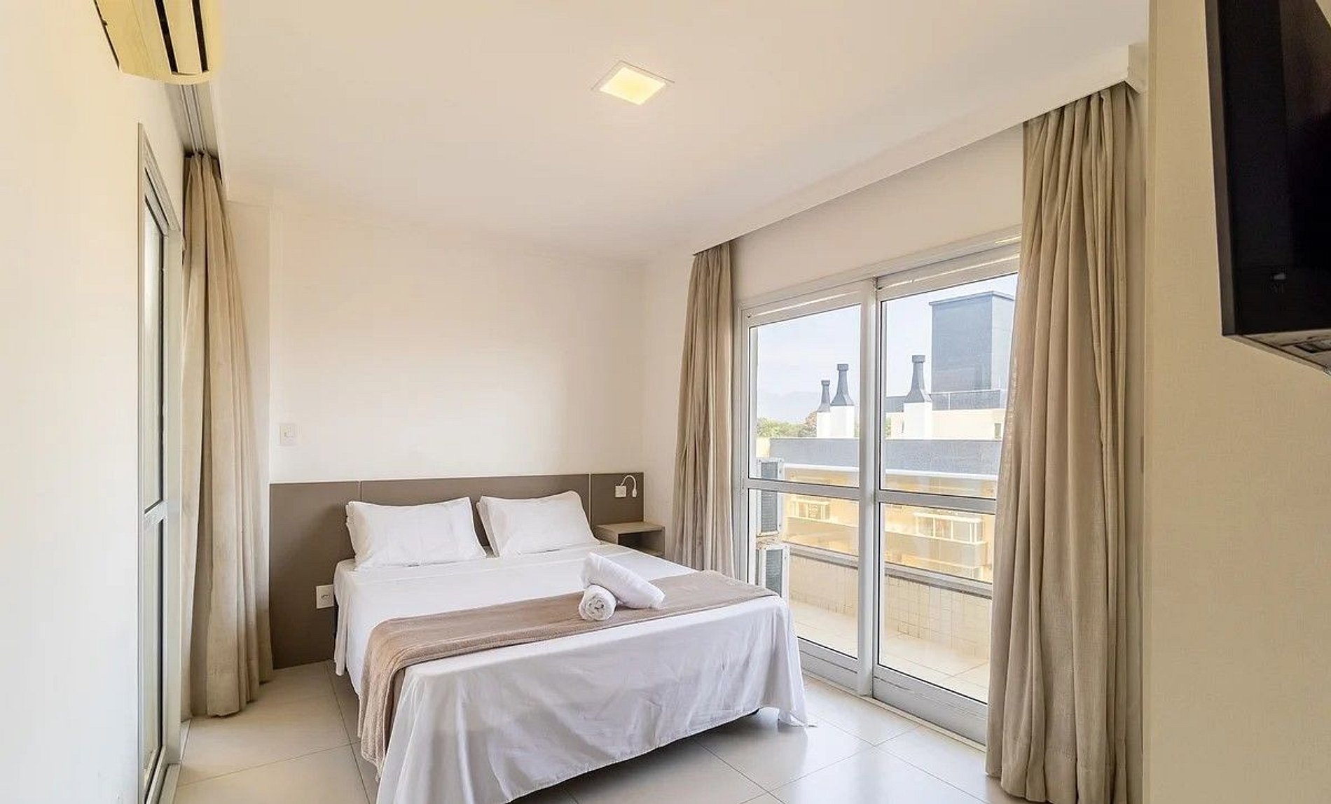 - 1 Quarto com cama de casal queen size, armário, tv e ar condicionado;