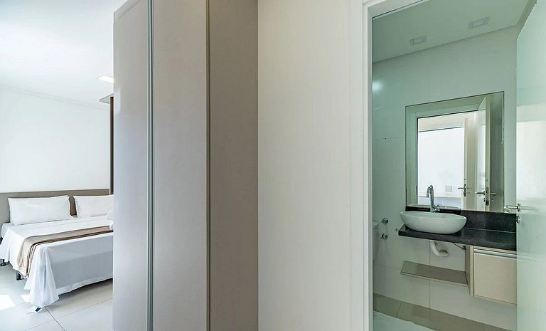 - 1 Quarto com cama de casal queen size, armário, tv e ar condicionado;