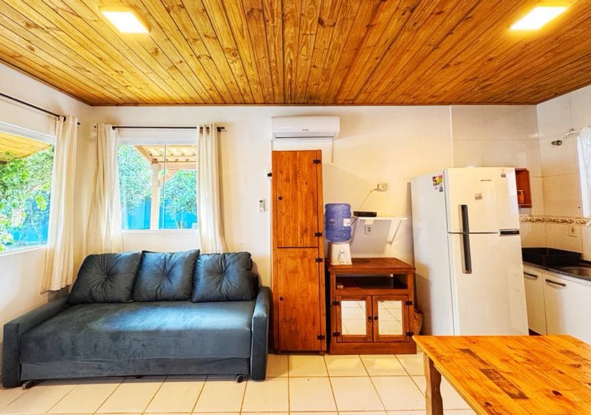 A cozinha e sala são conjugadas, com mesa para 5 pessoas, sala com ar condicionado, sofá-cama e TV, Internet Wi-Fi.