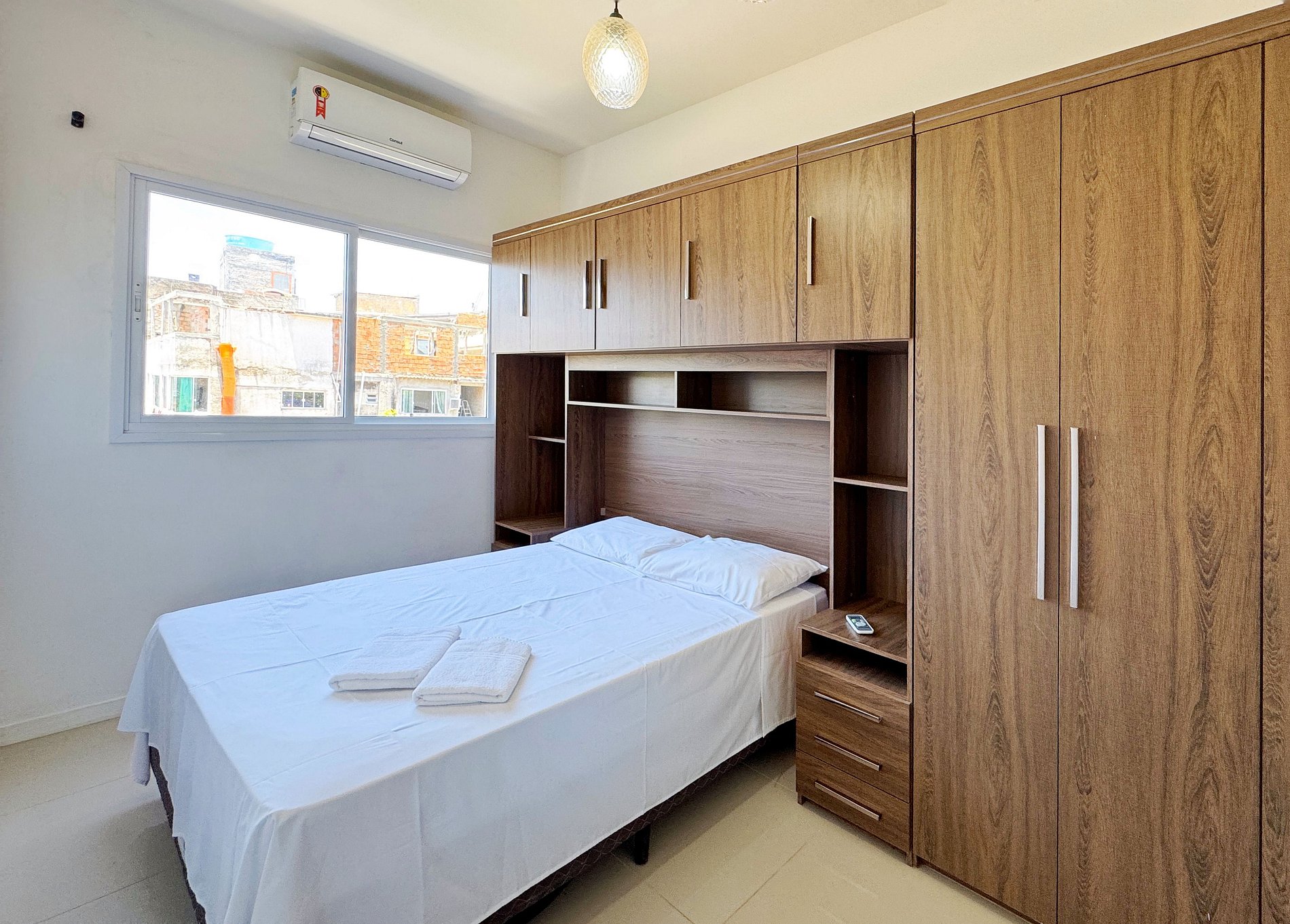 - 1 suíte com cama de casal e ar condicionado, armário para guardar roupas;