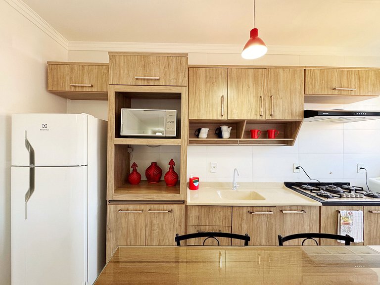 - Cozinha completa com geladeira, fogão, microondas, sanduicheira, liquidificador, utensílios domésticos e panelas;