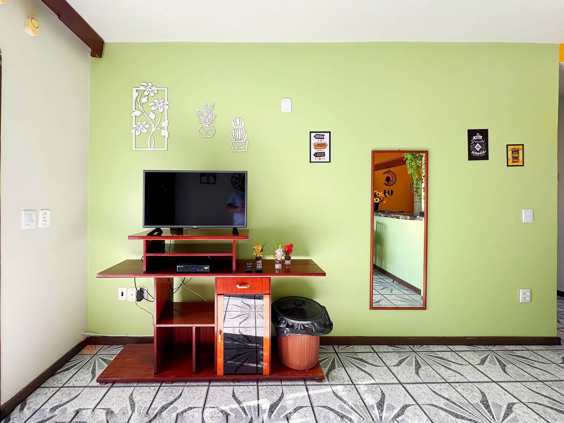- Sala de estar em conceito aberto com bancada, TV e sofá;