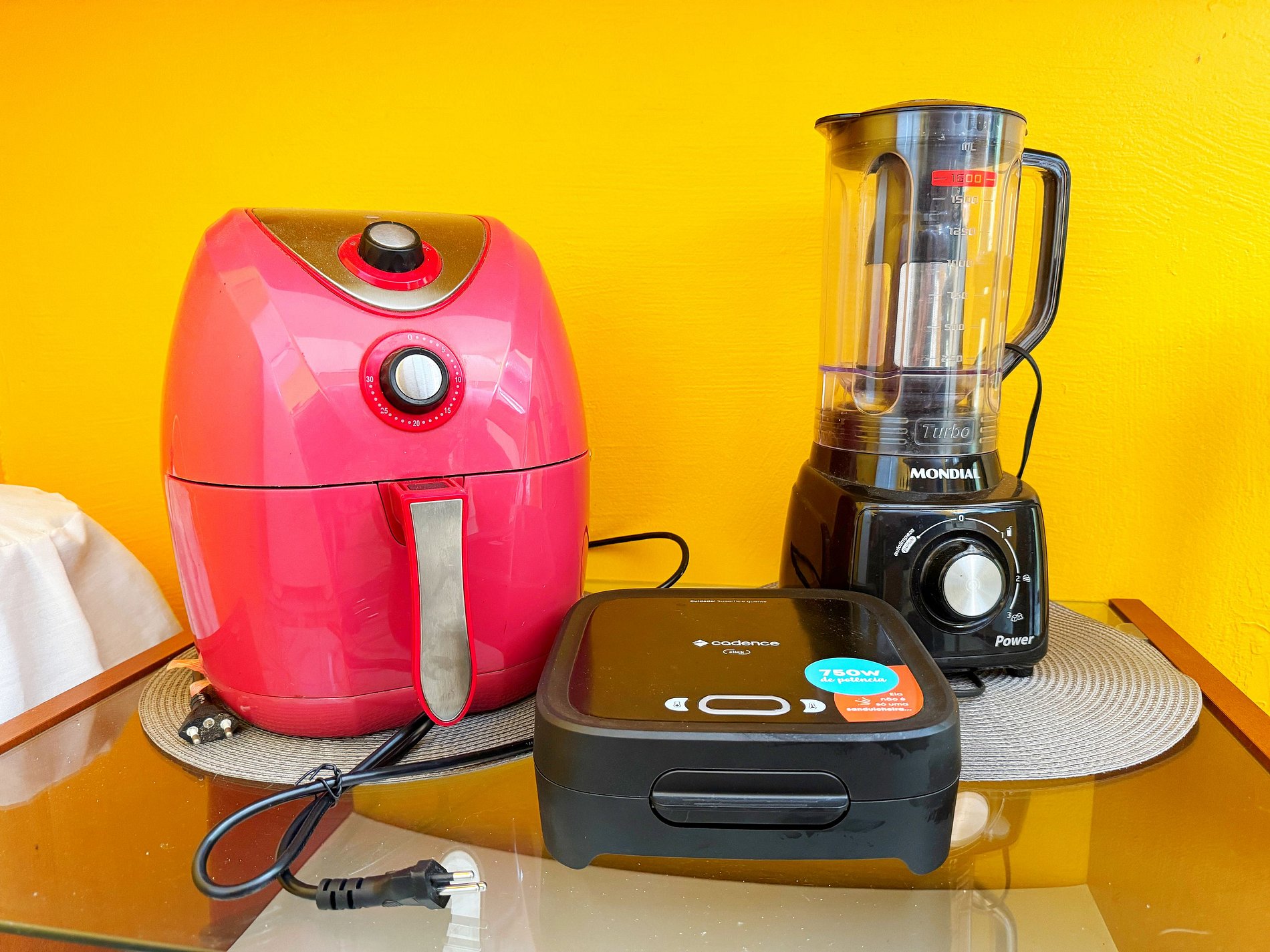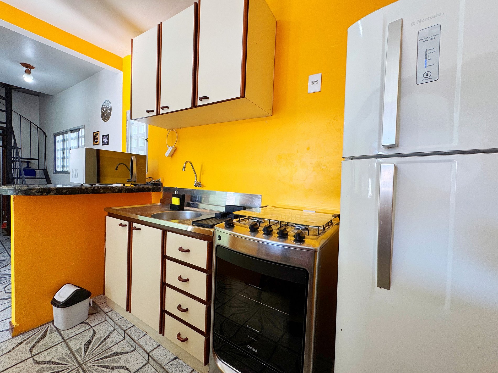 - Cozinha completa com geladeira, fogão, forno, microondas, kit café, liquidificador, utensílios domésticos e panelas;