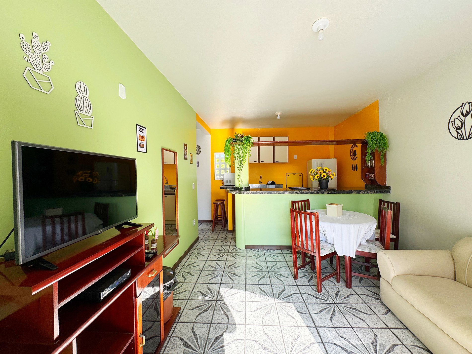 - Sala de estar em conceito aberto com bancada, TV e sofá;