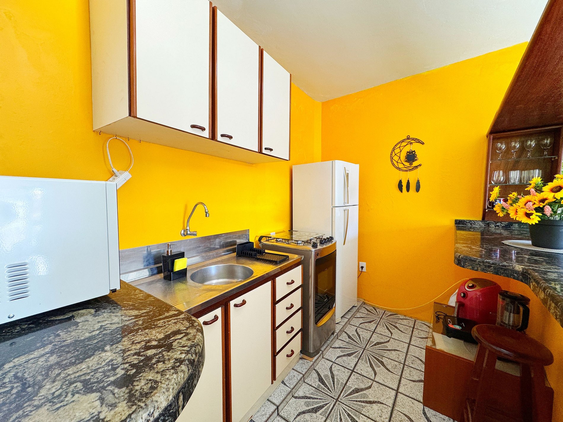 - Cozinha completa com geladeira, fogão, forno, microondas, kit café, liquidificador, utensílios domésticos e panelas;