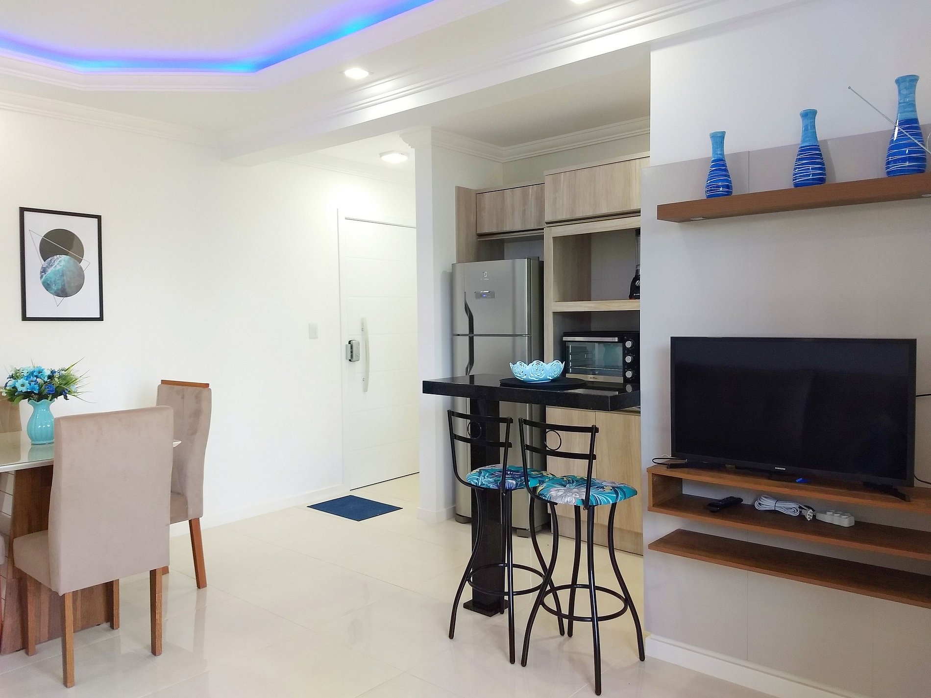 - Sala de estar em conceito aberto com mesa de jantar e sofá-cama;