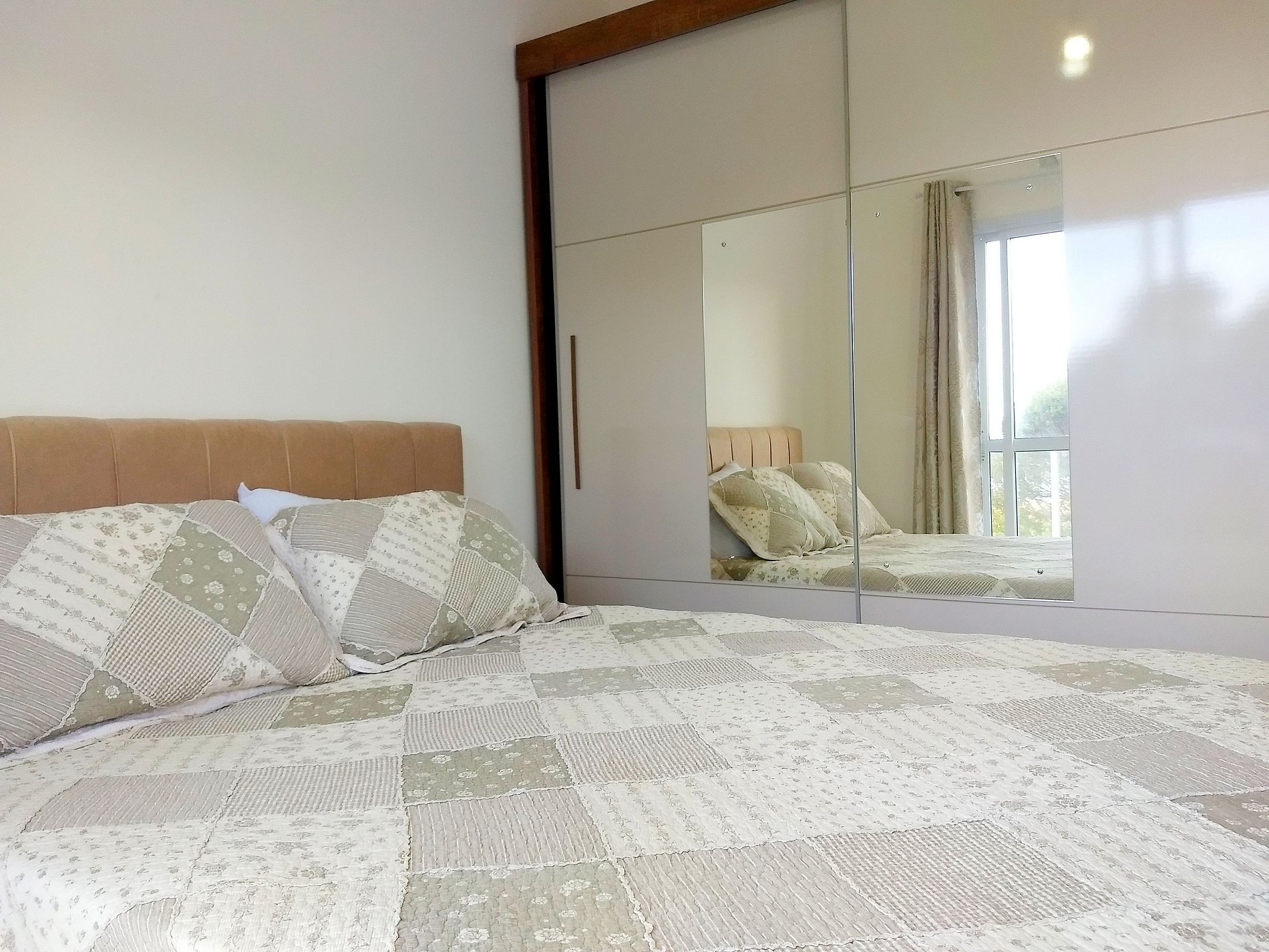 - 1 suíte com cama de casal, ar condicionado, armário para guardar roupas;