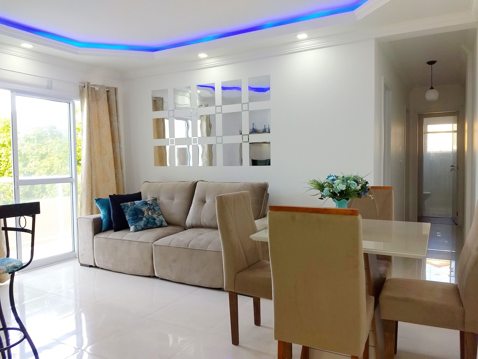 - Sala de estar em conceito aberto com mesa de jantar e sofá-cama;